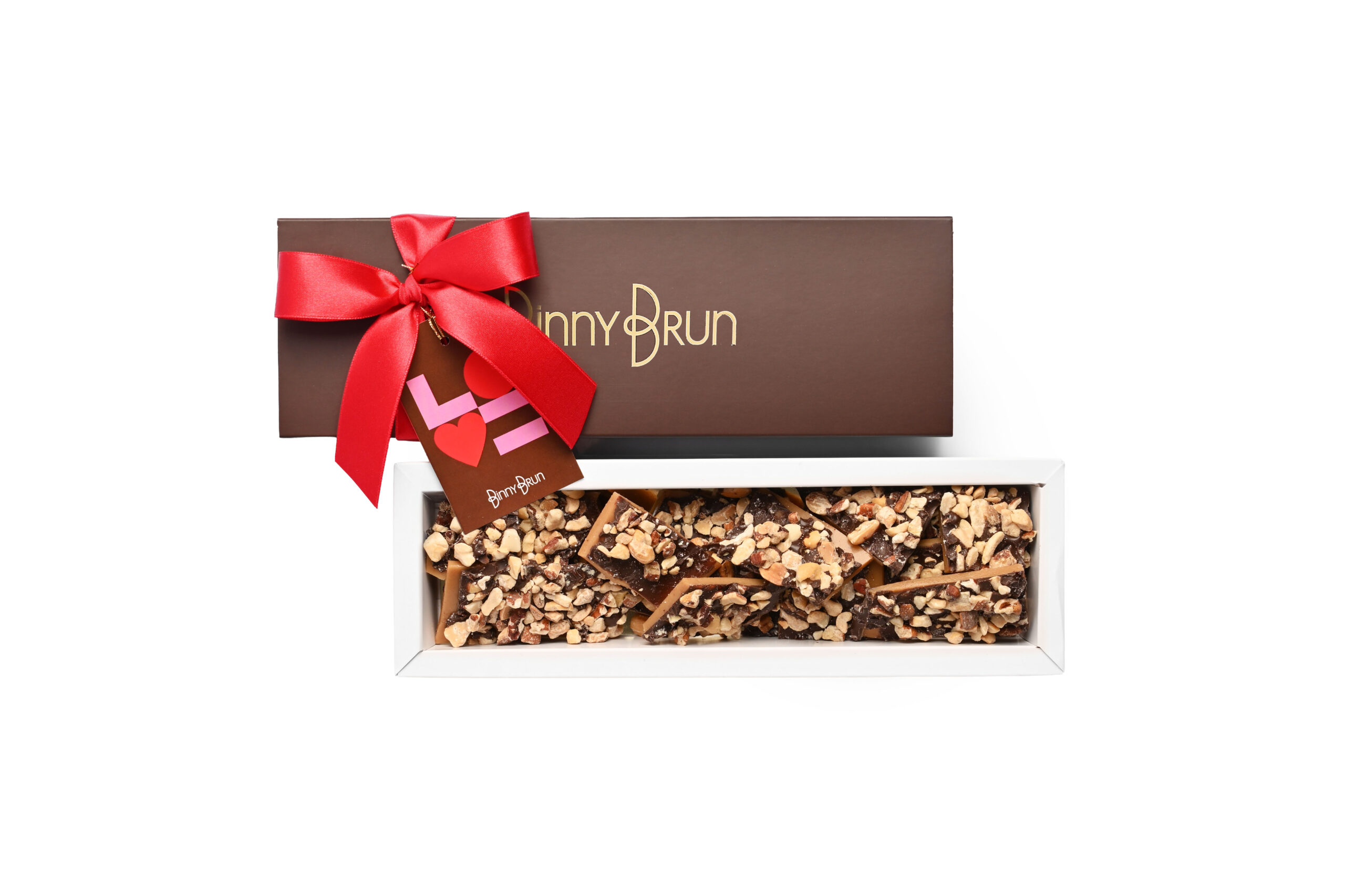 Caja con 120 grs de nuestro delicioso toffee con chocolate semiamargo 54% cacao y mix de nuez, almendra y cacahuates tostados. ¡Buenisimo!