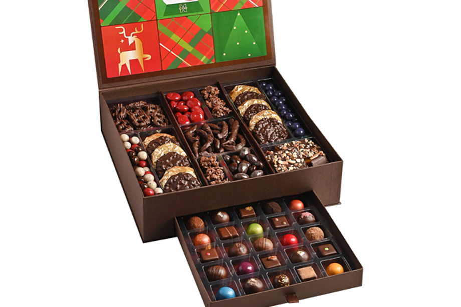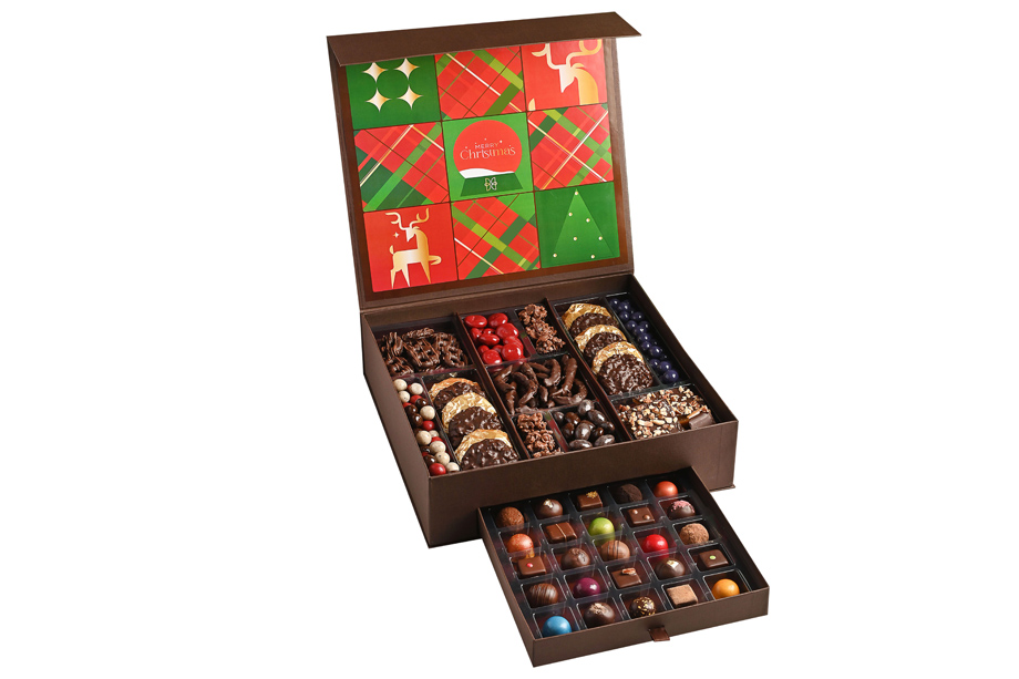La caja MEGA es ideal para los que aman el chocolate. Sorprende y consiente a tus seres queridos con un espectacular regalo que contiene todos nuestros productos favoritos en un surtido delicioso para compartir. El surtido incluye 25 trufas y bombones, 12 tortugones, toffee, cerezas, blueberries, caramelos y almendras cubiertas, orangette, pretzel y enjambres.