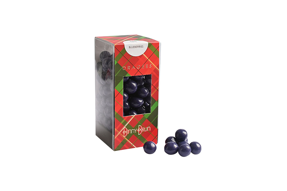 Exquisitas moras azules deshidratadas cubiertas en chocolate claro y confitadas. Cajas con 270 gramos.