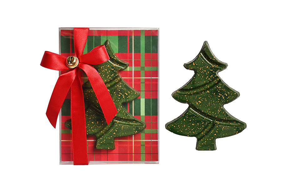 Pino de chocolate de leche relleno con pasta de pistache y kataifi tostado. Un detalle unico y delicioso para esta Navidad.