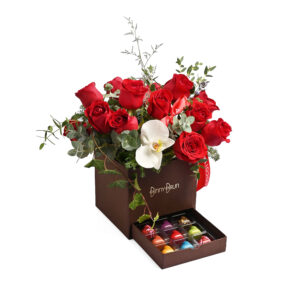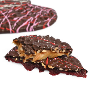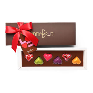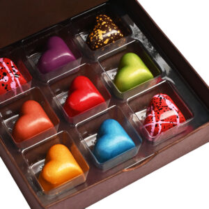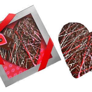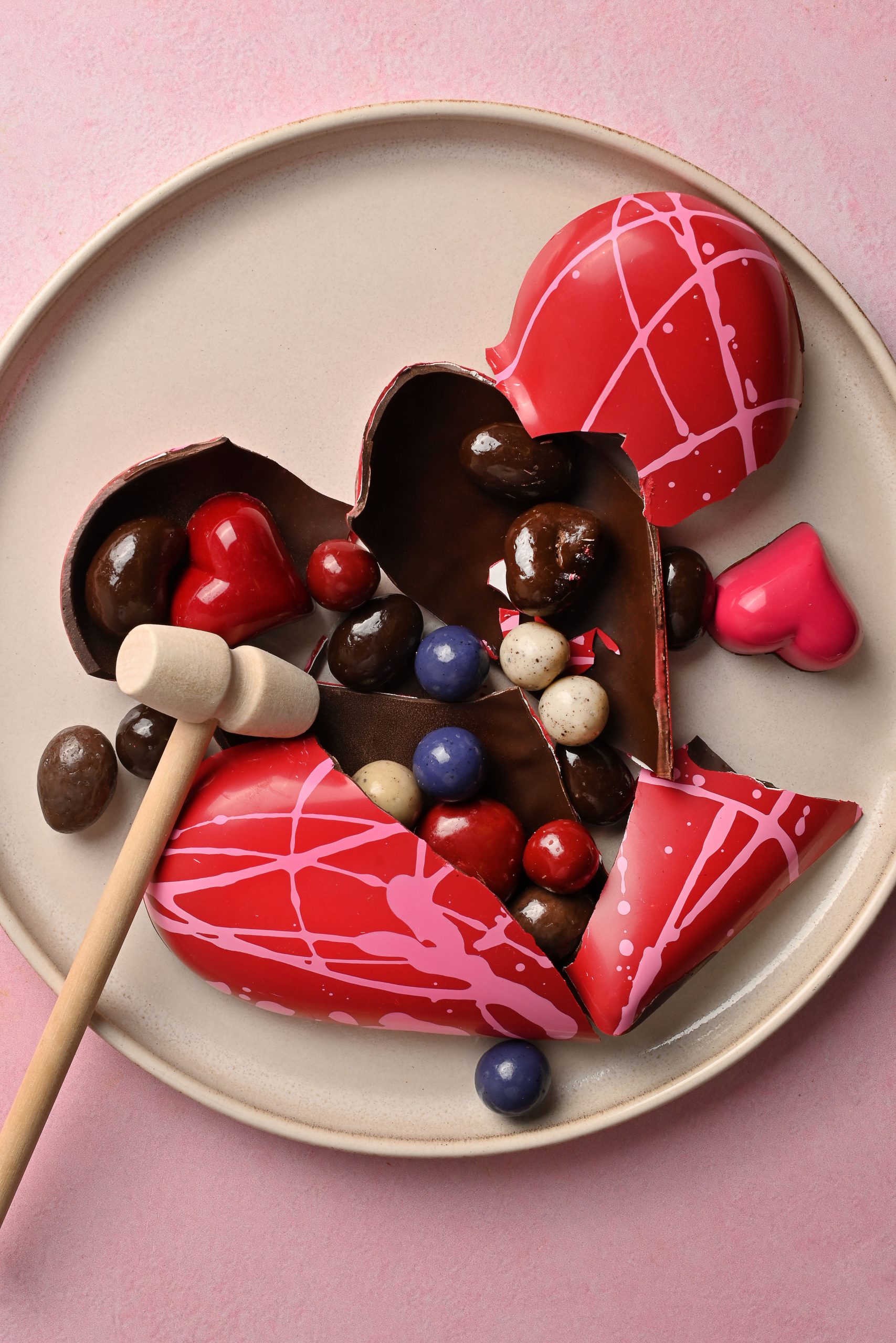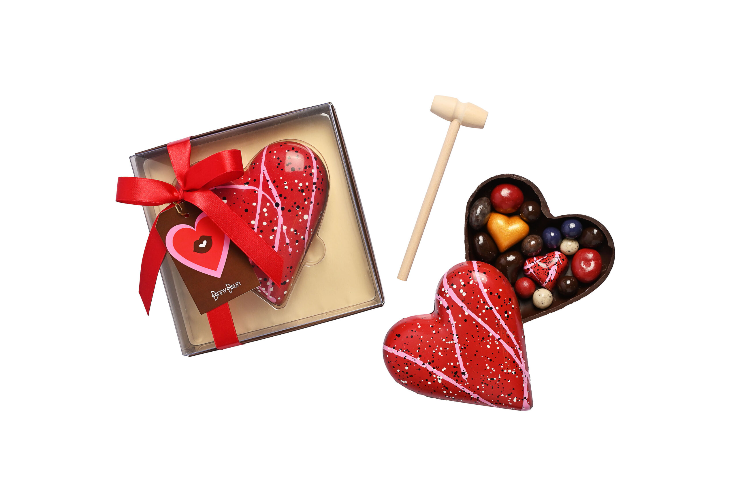 Corazón de chocolate semiamargo crujiente relleno con dos bombones de chocolate rellenos y una deliciosa variedad de dragées que incluye cerezas, blueberries, almendras, nuez de la india y caramelos cubiertos. Incluye martillo.